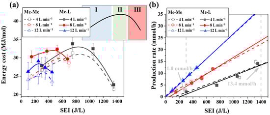 It is worth noting that although the EC of the process is considerably low at both low and high SEI values for all studied gas flow rates, the production rate of NF products increases significantly with an increase in SEI, as shown in Figure 8b. For example, in the Me–L system, with a flow rate of 4 L min−1, the EC is approximately 27 MJ/mol and 23 MJ/mol at an SEI value of 300 and 1400 J/L, respectively, which are very similar EC values. However, when looking at the production rate at these two SEI values, an increase of nearly 13 times could be observed in the production rate (from 1.0 to 13.4 mmol/h, as marked in Figure 8b). This clearly indicates that a high production rate can be achieved in combination with a low EC, which is possible in region III of the EC profile.