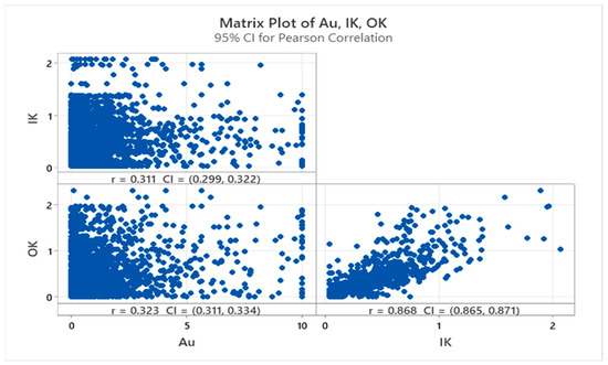 Indicator kriging has several advantages, including the ability to use complex data and soft data and the ability to estimate the probabilities of occurrence for a binary or categorical variable. However, it requires many samples to provide reliable estimates and can be affected by outliers. It also requires software proficiency and a strong understanding of spatial statistics and geostatistics [36]. In particular, it is a suitable choice when the data distribution is significantly skewed, which is commonly the situation in ore grade estimation. This is because it allows for more accurate predictions of the actual values of the variables.