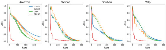 Figure 2 depicts the decline diagram of training loss value of four mixed models on all datasets. The zigzag curve is due to mild overfitting. CDF-LS can rapidly decline iteration according to the difference index between features in the early stage of training, and it is also applicable in difficult recommendation scenarios. This verifies that the introduction of contrast loss between short and long features is effective.