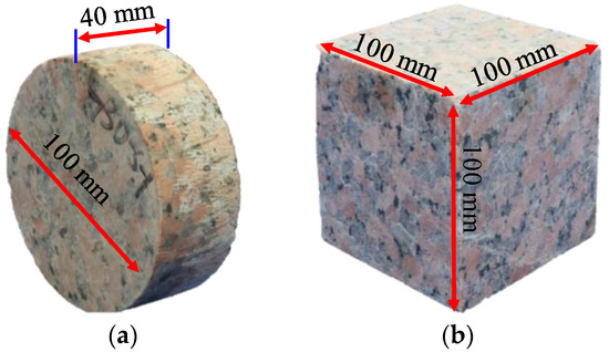 The rock material used is coarse red granite obtained from Wuhan city, Hubei Province, China. Several of the physical and mechanical parameters of the rock material are listed in Table 1. The rock specimens used are shown in Figure 3. A disc specimen (Figure 3a) with a diameter of 100 mm and thickness of 40 mm is used to conduct the Brazilian splitting tests. A cubic specimen (Figure 3b) with a side length of 100 mm is used to conduct a direct shear test.