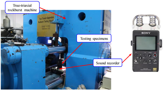 Experimental setup: True-triaxial rockburst machine testing system and sound recorder.