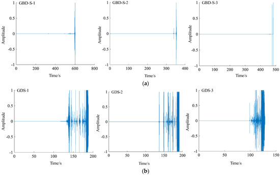 Figure 6a shows the sound signal obtained from the Brazilian splitting test. In the early stage of the test, the rock specimens are in a calm state, and there are no cracking sounds. In the late stage of the test, a small number of cracking sounds appeared gradually. The amplitude of these signals is low, indicating the small-scale failure in the specimen. At the end of the test, the sound signal with the maximum amplitude occurs, and the final macro failure occurs quickly. The dull “bang” sound can be heard by the human ear.