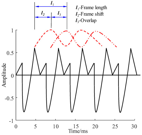 First, because the obtained sound signals are non-stationarity, “framing” should be performed to ensure that the sound signal is “smooth” within this frame length. Changes between two adjacent frames will affect the subsequent feature extraction of the sound signals, including tone color, tone, and other parameters of the sound signals. Therefore, the interval between the two frames is set, which is also called the frame shift. The overlap between the two frames can be calculated by overlap = frame length—frame shift. The frame of the signal is shown in Figure 7, and the frame parameters are determined as follows: the frame length is 10 ms, and the frame shift is 5 ms.