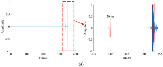 Third, the duration of the time-domain sound signal corresponding to a crack, a single sound signal, was determined. The general duration of a single sound signal used in current sound recognition is 10–50 ms. Considering the sampling frequency of the sound recording instrument used in this work, the duration used was 20 ms. With this duration, the sound signals were intercepted as shown in Figure 8.