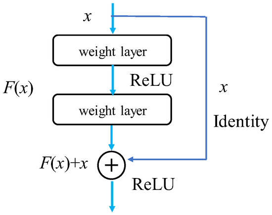 where σ is the activation function ReLU, and W1 and W2 are the calculations of the first and second weight layers, respectively. By establishing a shortcut connection, the mapping relationship can be expressed by Equation (4). When the dimension of the shortcut connecting x is different from that of F(x), a convolutional process Ws can be added to adjust the corresponding dimension, as shown in Equation (5).
