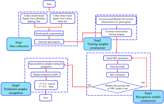 To perform recognition of tensile and shear cracks based on sound signals, the proposed method in our study employs spectrograms with the combination of the deep learning method and shallow Gaussian process machine learning. The basic idea of this method is shown in Figure 2, which is described in detail as follows.