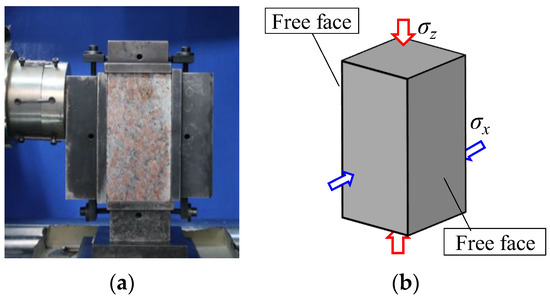 In our study, the true-triaxial rockburst testing machine developed at Guangxi University, China, is used to simulate the rockburst process. As shown in Figure 21, a loading path, “one free face, five stressed faces” is used, and the tested cuboid specimen has dimensions of 100 mm (width) × 100 mm (length) × 200 mm (height) [39]. The loading plan can be described as follows: σx and σy are increased to 30 MPa and 5 MPa; simultaneously, σz is increased at a rate of 0.3 MPa/s until the rock specimen fails.