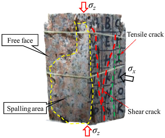 During the testing process, the voice recorder for collecting the sound signal is located approximately 20 cm from the tested specimens. The failure form of the tested specimen is shown in Figure 22. The tested specimen shows a binary failure characteristic, where more serious failure occurs at the free faces. A rockburst pit can be observed, and the surface of the rockburst pit is covered by rock fragments and powders. In addition, near the free face, a vertical tensile (splitting) crack can be observed. Away from the free face, several oblique cracks develop, and a lot of white powders are observed on the crack face, indicating a shear failure characteristic. It can be concluded that rockburst is characterized by the external tensile crack on the free face and the internal shear crack away from the free face. Consequently, an investigation on the development of tensile and shear cracks can provide beneficial information for the revelation of rockburst mechanisms.