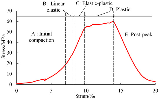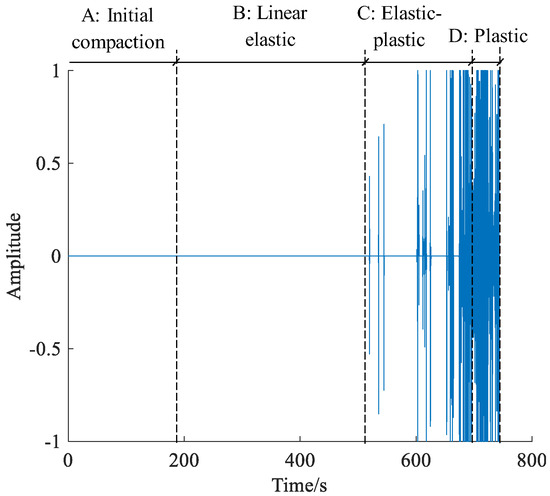 According to the characteristics of the stress–strain curve, the pre-peak deformation can be divided into four stages, as shown in Figure 23: A: initial compaction stage, B: linear elastic stage, C: elastic–plastic transition stage, and D: plastic stage. From 0 to 519.621 s, there are no sound signals. From 519.621 to 742.447 s, the sounds occur sporadically. The characteristics of the sound signal in the different stages are described in detail as follows.