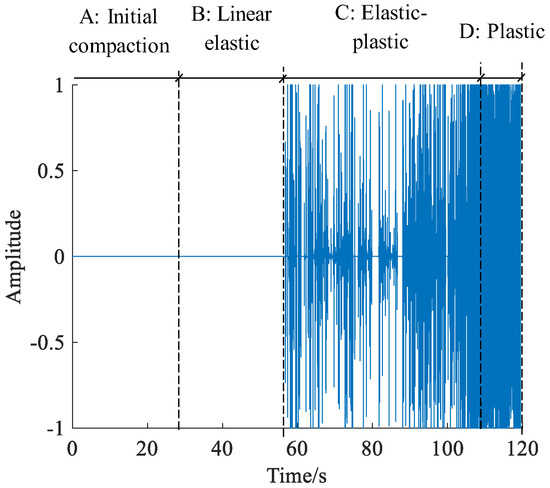 According to the change characteristics of the stress–strain curve, the pre-peak deformation can be divided into four stages, as shown in Figure 17: A: initial compaction stage, B: linear elastic stage, C: elastic–plastic transition stage, and D: plastic stage. The raw sound signal is also divided according to the corresponding four stages, as shown in Figure 18. Since the rock specimens have failed in the post-peak period, the recording of sound signals is stopped in that stage after 119.4 s. From 0 to 56.743 s, there are no sound signals. From 56.743 to 119.4 s, the sounds occur sporadically throughout the recording time.