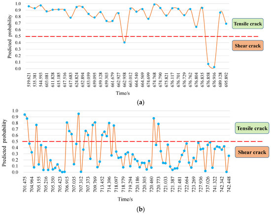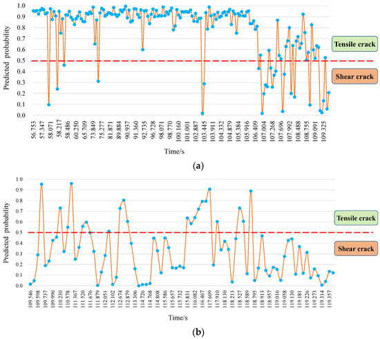 The variation in the tensile and shear sound signals obtained using the proposed method is shown in Figure 24. The abscissa indicates the time when the sound signal of the crack occurs, and the ordinate indicates the predicted probability of GPC. When the predicted probability of GPC is greater than or equal to 0.5, a tensile crack is predicted, and when it is less than 0.5, a shear crack is predicted. The proportions of tensile and shear crack sound signals in different deformation stages are shown in Table 6. It can be seen that sound signals caused by tensile cracks occur in the early stage of rockburst, and shear cracks occur in the late stage. In the elastic–plastic stage (519.621–700.92 s), the tensile sound signals account for 92%. The proportion of the shear sound signal rises to approximately 8%. During the plastic stage (700.92–742.447 s), the number of shear sound signals continually increases, and the proportion of the shear sound signals accounts for more than 80%.