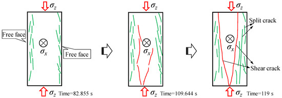 The tensile and shear crack development during rock failure under biaxial conditions is shown in Figure 20. The rock specimen undergoes a typical process from tensile crack development on both sides to internal shear cracks, which is consistent with previous research [35]. Consequently, it can be seen that the proposed method is feasible.