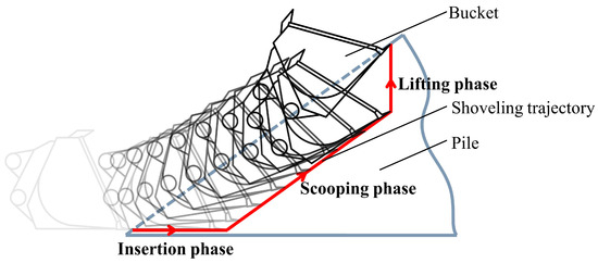 The wheel loader is a relatively versatile construction vehicle widely used in many civil engineering and mining projects. It usually performs a variety of tasks, including shoveling, transporting, and dumping [1]. Among them, the most important form of operation is shoveling. The fuel consumption in the process of shoveling is one of the critical indicators for evaluating the operational efficiency of wheel loaders [2]. Reducing the fuel consumption of wheel loaders in shoveling operations has become an urgent problem. Numerous studies have shown that the fuel consumption of wheel loader shoveling operation is closely related to the shoveling trajectory. The shoveling trajectory is the track of the wheel loader bucket moving in the pile. The fuel consumption of wheel loader shoveling operations with different trajectories has obvious differences [3,4]. Thus, optimizing the shoveling trajectory is an effective way to reduce the fuel consumption of shoveling operations.