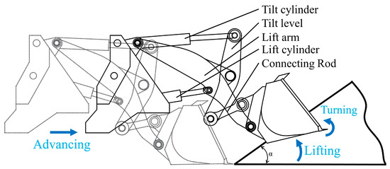 The shoveling method is characterized by the insertion of the wheel loader into the pile to a certain depth. Then, the bucket is turned and lifted by the action of the lift arm, tilt level, and connecting rod to complete the shoveling. Finally, the bucket is lifted. Among them, the shoveling trajectory of the scooping phase is parallel to the surface of the pile, as shown in Figure 1. Thus, the wheel loader can be regarded as a system with three degrees of freedom when carrying out the shoveling operation, which is wheel loader advancing, bucket lifting, and bucket turning. Among them, the bucket lifting and turning are controlled by the lift cylinder and the tilt cylinder, respectively, as shown in Figure 2. The wheel loader displacement, lift cylinder displacement, and tilt cylinder displacement are not the same in different shoveling trajectories, which is the reason for the large difference in fuel consumption during the shoveling operation of wheel loaders. Meanwhile, the different engine speeds provide different power to the wheel loader. Even if the same shoveling trajectory is used, however, due to the difference in engine speed, the fuel consumption of the shoveling operation will also appear as a large gap. Therefore, optimizing the shoveling trajectory at different engine speeds is a critical way to reduce the fuel consumption of the shoveling operation.