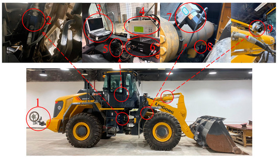 To execute the shoveling trajectory better and avoid the errors caused by manual operation. And to obtain more accurate data about the shoveling process, this study has developed an automatic shoveling experiment platform for a wheel loader. The platform will carry out automatic shoveling by preplanning the shoveling trajectory and setting the relevant shoveling parameters. The relevant parameters during the shoveling operation are recorded, including the wheel loader displacement, cylinder displacement, fuel consumption, engine speed, operation time, and shoveling weight. The recording frequency is 500 Hz, which is recorded once every 0.002 s. The automatic shoveling platform and the main sensors are shown in Figure 3.