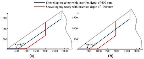 Due to the different insertion depths, the shoveling trajectories are also different. The fuel consumption of shoveling operations with different shoveling trajectories has obvious differences. In this study, a variety of insertion depths are randomly selected, ranging from 600 mm to 1000 mm. Two types of materials are selected, including gravel and sand. Gravel is characterized by non-uniform, high-density, and large particles. At the same time, sand is characterized as uniform, low-density, and with small particles. Both above materials have high representativeness, and the relevant parameters of the two materials are shown in Table 1. Due to the different angles of repose of the two piles, their shoveling trajectories are also different, as shown in Figure 4.