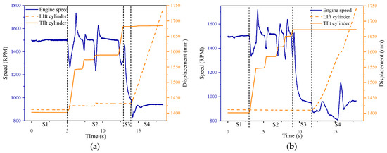 When the engine speed is 1500 RPM, the engine speed for shoveling gravel and shoveling sand is shown in Figure 7. The shoveling operation process can be divided into four phases with the change of displacement of the lift cylinder and the tilt cylinder, which are the insertion phase, scooping phase, stopping phase, and lifting phase, corresponding to S1, S2, S3, and S4 in Figure 7, respectively.