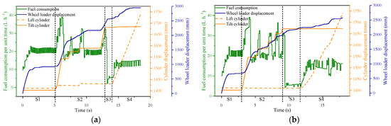 The sensor on the wheel loader is a flow sensor. The total fuel consumption needs to be obtained by the calculation formula, which is shown in Equation (3). As an example, in Figure 8, the total fuel consumption, the fuel consumption of each phase, and the percentage of the total fuel consumption by each phase are shown in Table 2.