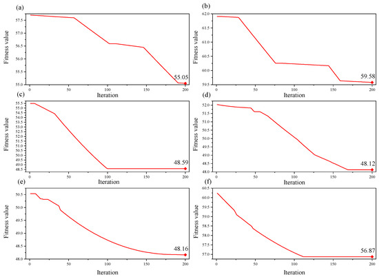 IPSO optimization iterative process. (a) Gravel-900 RPM; (b) Gravel-1200 RPM; (c) Gravel-1500 RPM; (d) Sand-900 RPM; (e) Sand-1200 RPM; (f) Sand-1500 RPM.