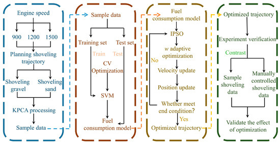 However, there are fewer applications for modeling the fuel consumption of wheel loaders using machine learning. Liu et al. [29] constructed a BP neural network model with wheel loader driver, pile type, and bucket capacity as input features, although the accuracy of the model was high. However, in this study, there are problems of fewer data samples and unreasonable selection of fuel consumption influencing factors, which are difficult to be extended to other application scenarios. Since the shoveling process itself is a high randomness process. There are many factors that can have a great impact on the fuel consumption of shoveling operations. Therefore, determining the reasonable influence factors on the fuel consumption of shoveling is the key task to establishing the fuel consumption model by machine learning. Therefore, this study selects the Kernel Principal Component Analysis (KPCA) method to filter the factors that have a strong influence on the fuel consumption of shoveling operations. Compared with the traditional Principal Component Analysis (PCA) method, KPCA has better nonlinear data processing capability [30]. After obtaining the factors with a strong influence on the fuel consumption of the shoveling operation, a model of the fuel consumption of the shoveling operation is constructed using Support Vector Machine (SVM), a typical machine learning method. It replaces the empirical risk in traditional neural networks with the structured risk minimization principle. It solves the drawback that it is difficult to overcome the local extremes when the sample size is small [31]. After establishing the fuel consumption model, the Improved Particle Swarm Optimization (IPSO) algorithm is selected in this study to optimize the factors with a strong influence on fuel consumption. Compared with the Particle Swarm Optimization (PSO) algorithm, IPSO greatly improves the ability of local optimization search. The optimization algorithm has been widely used to improve operational efficiency by optimizing the operational trajectory. For example, Yuasa et al. [32] optimized the excavating trajectory of an excavator by a Genetic Algorithm based on a parametric mathematical model of the excavating trajectory, loading, and linkage mechanism, which effectively improved the operational efficiency of the excavator. Bi et al. [33] obtained the optimal shoveling trajectory of a cable shovel by a Multi-Objective Genetic Algorithm with the operating time and energy consumption per payload as the optimization objectives.