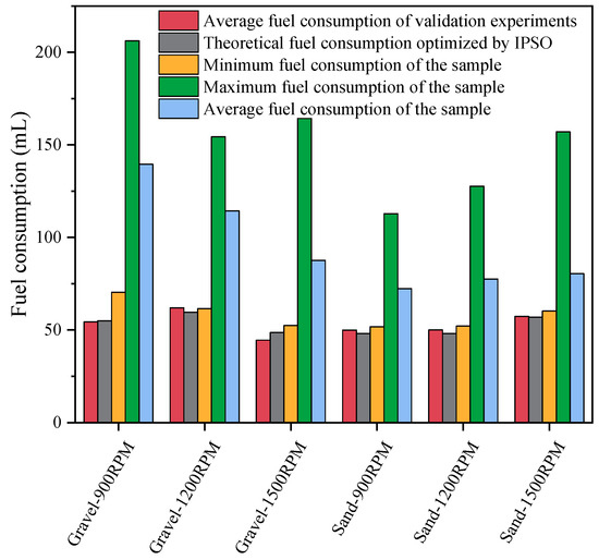 The average fuel consumption of the validation experiment, the theoretical fuel consumption of IPSO optimization, the minimum fuel consumption of the sample, the maximum fuel consumption of the sample, and the average fuel consumption of the sample are shown in Figure 13. The deviation between the average fuel consumption of the validation experiment and the theoretical fuel consumption of IPSO optimization is small. The maximum deviation value is 8.23%, and the accuracy of the fuel consumption model is high. The deviation from the actual shoveling operation is small. In Gravel-1200 RPM, the experimental average fuel consumption is slightly higher than the minimum fuel consumption of the sample, and the fuel consumption is improved by 0.62%. However, in the other models, the average fuel consumption of the validation experiment is reduced compared with the minimum fuel consumption of the sample. Among them, the maximum reduction in fuel consumption is 22.63% in Gravel-900 RPM. The average fuel consumption of the validation experiment is substantially reduced compared to the sample maximum fuel consumption, with a maximum reduction of 73.65% and a minimum reduction of 55.70%. In the gravel model with three different engine speeds, the average fuel consumption of the validation experiment is reduced by 60.93%, 45.79%, and 49.10%, respectively, compared to the sample average fuel consumption. In the sand model with three different engine speeds, the average fuel consumption of the validation experiment is reduced by 30.93%, 35.56%, and 28.59%, respectively, compared with the sample average fuel consumption. The optimized shoveling trajectory effectively reduced the fuel consumption of the shoveling operation.