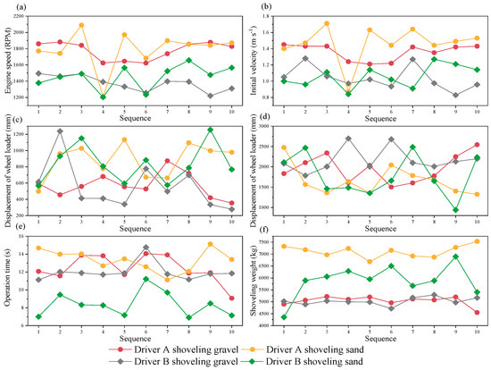Parameters of the shoveling process for driver A and driver B. (a) Engine speed; (b) Initial velocity; (c) Displacement of wheel loader in insertion phase; (d) Displacement of wheel loader in scooping phase; (e) Operation time; (f) Shoveling weight.