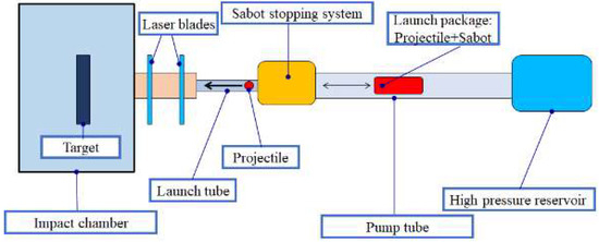 Figure 1 represents the key parts of the single-stage LGG. The launch package, which consists of the protective sabot and the projectile, is accommodated in the pump tube downward and is accelerated with the high-pressure gas from the first stage. The first-stage reservoir contains an inert gas, such as helium (He), under high pressure. After the acceleration phase, a sabot-stopping system enables the projectile to be detached from the sabot; the mechanism of this system is described in Section 3. Two laser blades in the launch tube monitor the projectile’s trajectory toward the target while measuring its velocity; the projectile finally impacts the target in the impact chamber.