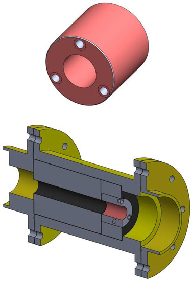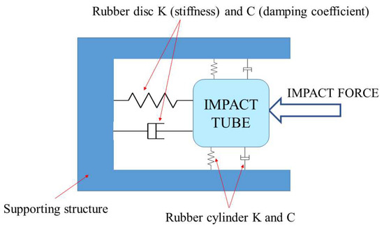 The conceptual overview of the system is described here. The launch package hits the sabot-stopping system and delivers a force to the impact tube, which is dissipated via the rubber cylinder, stopping the sabot and allowing the projectile to continue its path to the target. The LGG supporting structure is protected by the transferred momentum using the properties of stiffness and damping of a rubber disc and cylinder. Radial deformations are reduced by the disc design that surrounds the tube, while axial deformations are kept to a minimum by the cylinder. By adopting this approach, it is possible to protect the holder, which is held up by the support structure and restrained by the two flanges. This structure has the advantage of allowing for the replacement and testing of a variety of impact tube types without adding to the system’s complexity [48].
