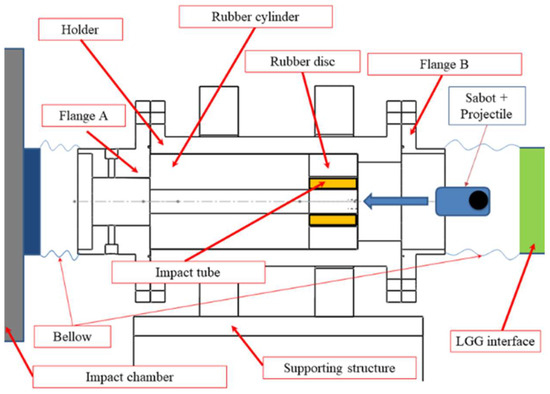 The concept of the system is schematically shown in Figure 3, which also demonstrates the dissipation mechanism principle for the impact force. A tentative configuration of the key elements is shown in Figure 4. The holder for the sacrificial impact tube assembly, which consists of an impact plate with a rubber disc surrounding it and a rubber cylinder behind it, is part of the sabot system. After the shot, the primary component in interacting directly with the sabot is the impact tube. Between the impact chamber and the LGG pump tube, the holder is inserted into a supporting frame with flanges that allow for different mounting options. Several tests can be completed in a single day due to the unique design of the single-stage LGG, whose components are not destroyed or compromised during shot operations. The novel sabot-stopping system proposed here is also designed to mechanically decouple the target from the sabot-stopping system, overcoming the transmission of unwanted vibrations to the target.