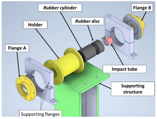 The third phase involves the structural FEA of the rubber cylinder (partial). Figure 5 presents a general overview of the sabot-stopping system, while Figure 6 shows the sabot-stopping system exploded view, highlighting the main components, in particular the impact tube, rubber disc, holder, and supporting structure.
