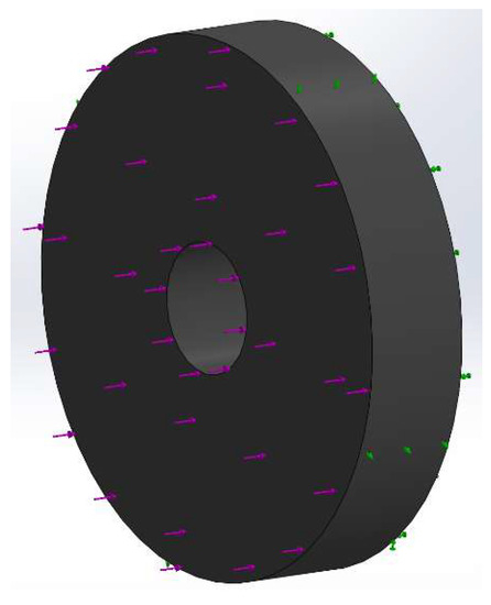 In the FEM, the impact force is applied to all nodes on face 1 and acting in the direction along the longitudinal axis, while the opposite end of the disk (face 2) is fixed in all D.O.F., representing the fixed exiting wall surface. Nodes on the surface of the outer cylinder wall are fixed in all D.O.F. of the cylinders longitudinal axis, i.e., the external diameter is fixed, representing the metal tube wall holder.