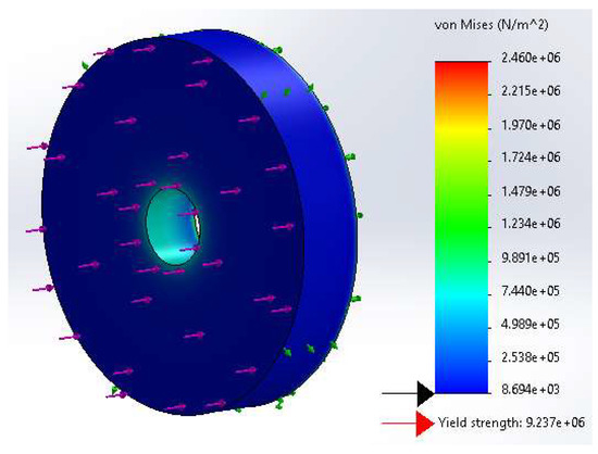 The FEM was used to estimate the maximum von Mises stress predicted for the rubber cylinder, which was found to be 2.46 MPa (Figure 12). This value is lower than the typical yield strength for rubber (10 MPa) and is within acceptable limits. It is important to note, however, that the stress distribution is not uniform across the rubber cylinder. In fact, the maximum stress occurs at the inner hole on the opposite face to the impact. This could potentially cause an issue if the projectile clearance with the impactor is less than 2 mm, as the maximum displacement predicted (1.96 mm) occurs at the inner hole (Figure 13). This results in a conical decrease of the diameter, which could lead to a collision or interference of the projectile with the sabot-stopping system. To illustrate this issue, Figure 14 has been included, which shows the potential for collision or interference. If such an event were to occur, it could cause the failure of the region in the impactor tube, which could result in contamination of the projectile and/or the target. It is therefore important to carefully consider the displacement relating to the reduction of the length of the impactor tube, which amounted to 0.8 mm.