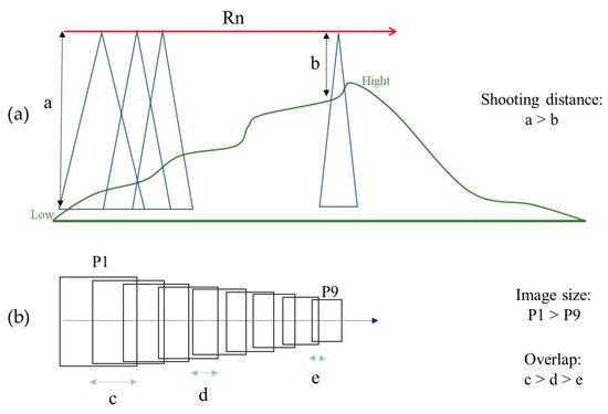 When the UAV uses the same altitude to shoot vertically, if the area is flat, the UAV can keep the same altitude to take photos. However, when photographing in mountainous regions, if you still choose to keep the same altitude for photographs, it will affect the image shooting distance, resulting in an impact on the GSD and overlap, as shown in Figure 2. Figure 2a shows that when UAVs photograph at the same altitude, the shooting distance is shortened as the terrain rises (a > b), resulting in a significant difference in image resolution, and the ground image area that can be covered becomes smaller (c > d > e), as shown in Figure 2b, which reduces the image overlap. The above scenario shows that aerial photography at the same altitude will result in inconsistent image quality when taking pictures of rugged slope areas.
