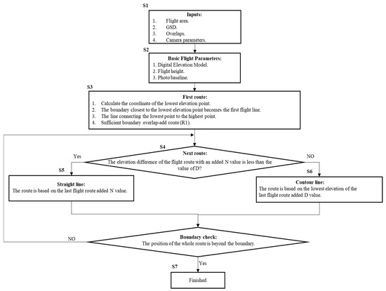 The method proposed in this study to generate contour-type aerial routes is shown in the flowchart in Figure 3, steps S1–S7. First, in S1, the user provides information about the aerial photo area, camera, and mapping requirements. In S2, the system extracts the terrain information from the DEM and calculates the flying height and shooting baseline. In S3, the location of the first flight line is calculated based on the relationship between the lowest and highest elevations and the boundary line. In S4, the system will consider the distance between the routes and the topographic changes corresponding to the routes, and use either S5 or S6 to generate the routes, depending on the situation, until the highest point elevation is calculated and the routes for the whole area are planned. The entire process uses the principle of contour to maintain the consistency of the shooting distance, which can improve the image quality and coverage, thus improving the effect of aerial photography by UAV.