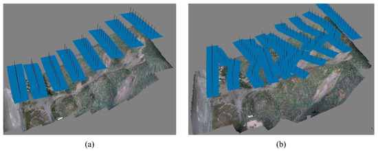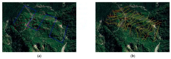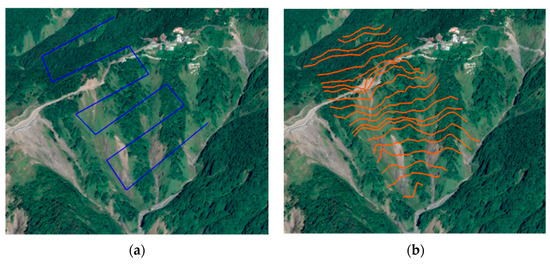Case 1 is located in Nanhua District, with an elevation of 190–300 m, a slope of 24 degrees, and an area of 60,000 m2. This study used a grid and contour simulation for route planning, as shown in Figure 4. The grid-type routes were divided into 5 routes with 35 images, while the contour-type routes were divided into 14 routes with 187 images.