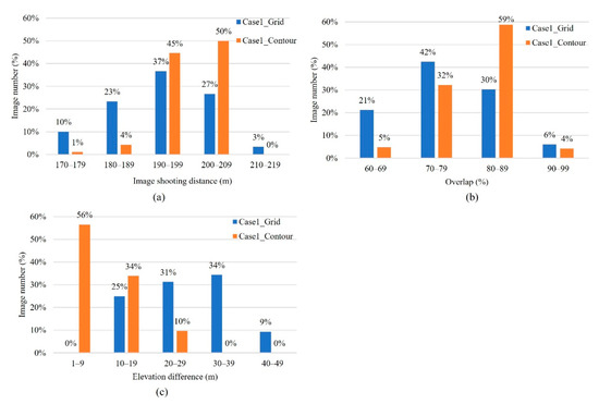 Case 2: Analysis of route planning results. (a) Image shooting distance, (b) overlap rate, (c) elevation difference.