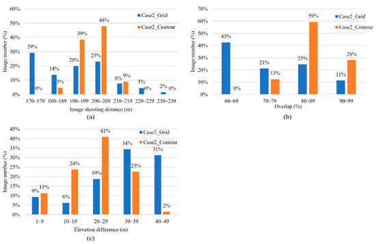 It is noteworthy that the contour-type has a higher percentage of images with elevation differences within the threshold value within the same image compared to the grid-type. In both Case Study 1 and Case Study 2, there was a 44% and 40% increase, respectively, in the percentage of images with elevation differences less than 30 m within the same image. In the field test, 100% of the images in the contour-type were less than the threshold of 150 m of elevation difference in the same image, while only 65% of the images in the grid-type did. The contour-type increased the percentage of images by 35% over the grid-type. Although the contour-type has two times more images, the contour-type flight route planning helps to improve the elevation difference in the acquired images so that the resolution of the images can be maintained at the same quality and the accuracy of the results can be improved.