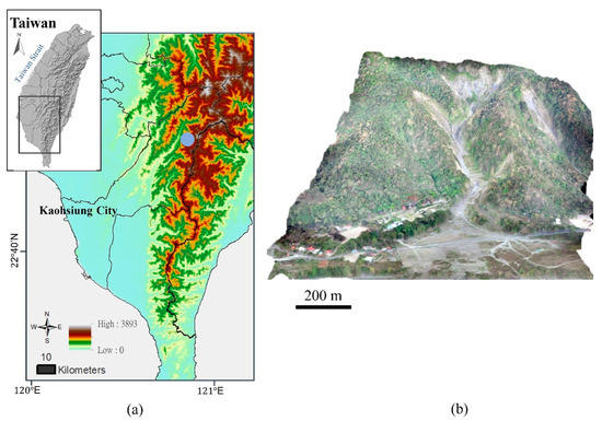 Geographical location of the study areas. (a) Study area location, (b) Liugui study area shown as a three-dimensional model.
