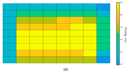The results of calculating the overlap between images are shown in Figure 12, from which it can be observed that the overlap between adjacent images is similar. The data show that the average overlap is 82%, the overlap is lower only at the edge of the working area, and more than 70% overlap can be maintained in steep terrain.