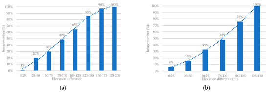 From the location of the UAV, we can calculate the range of each image covering the ground, and the highest and lowest elevations in that range are obtained to calculate the elevation difference. The amount of elevation difference for each image is shown in Figure 13. From Figure 13a, the grid-type maximum elevation difference is 175–200 m, and 65% of the images have an elevation difference of less than 150 m. From Figure 13b, the contour-type maximum elevation difference is 125–150 m, and the elevation difference is less than 150 m for 100% of the images.