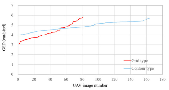 The GSD of the image is directly affected by the elevation. Ideally, the GSD of each image should be the same, but the topographic relief will change the height and directly affect the GSD. In this study, the results of calculating the GSD from the images taken by the two methods are shown in Figure 14. The GSD of the contour-type is 4–5.7 cm, and the grid-type is 3.1–5.8 cm, as shown in Figure 14. From Figure 14, we can find that the contour-type is better than the grid-type method. Therefore, this study proposes that the contour-type method based on a DEM can effectively plan the flight height that meets the user’s needs and effectively make the difference of GSD smaller.