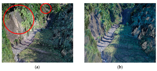 The distribution of point clouds for two types of routes. (a) Grid-type flying mission, (b) contour-type flying mission. The point clouds of the grid-type are sparse, especially in the valleys (red circles) with holes in the point clouds. In contrast, the contour-type has a more complete representation.