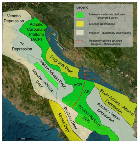 The Adriatic Basin is characterized by distinct depressions of varying ages that formed at different times [12] (Figure 1). The Po and South Adriatic–Albania depressions are the largest but do not have continuous borders or depositional environments throughout their geological history. This is evident from variations in sediment thicknesses, areas, and unconformities between different lithological units [13,14]. Furthermore, these depressions are mostly asymmetrical in shape. In Croatia, the depressions include the entire Dugi Otok Depression, the eastern parts of the Po and Middle Adriatic Depressions, and the northern part of the South Adriatic–Albania Depression.