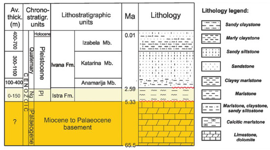 The Plio-Pleistocene clastic complex is significantly thicker in Italian than in the Croatian part of the Adriatic basin. Consequently, Italian lithostratigraphic nomenclature is defined in much more detail than Croatian, where the whole Paleogene to Pleistocene complex belonged to Susak Formation. Velić and Malvić (2011) [14] pointed out the need and introduced new lithostratigraphy nomenclature for the Croatian part of the basin. According to that nomenclature, Paleogene, predominantly carbonate deposits, belong to the Susak Fm., up to 500 m thick Pliocene clastics to Istra Fm., and 400–1900 m thick Pleistocene clastic complex to Ivana Fm. That division was refined by introducing Anamarija, Katarina, and Izabela members within the Ivana Fm. [16] (Figure 2).