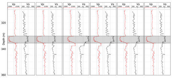 Vp and Vs logs from several pseudo-wells created to calculate Rock Physics properties changing porosity and reservoir thickness. The reservoir interval is in grey.