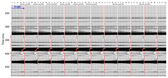 AVO modeling was performed to create synthetic seismic gathers for each pseudo-well based on created logs. The synthetic gathers were calculated using the P-wave reflection coefficients obtained from the Zoeppritz equations [23] and a wavelet extracted from actual seismic data. Synthetic gathers generated from 12 pseudo-wells are shown in Figure 6.