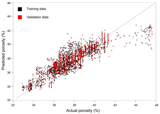 DFNN validation cross-plot, which compares actual and predicted total porosity. For validation is used 30% of overall input wells.