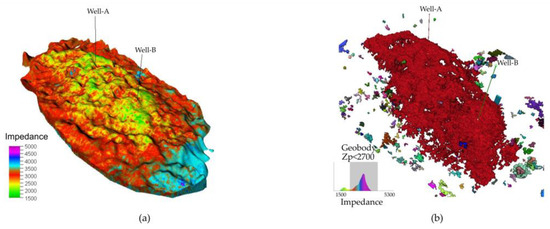 Horizon probe from pre-stack Acoustic Impedance (Zp) volume covering reservoir interval (a) and extracted Reservoir geobody for Zp values lower than 2700 (m/s)(g/cm3) considered to match gas-saturated reservoir volume (b).