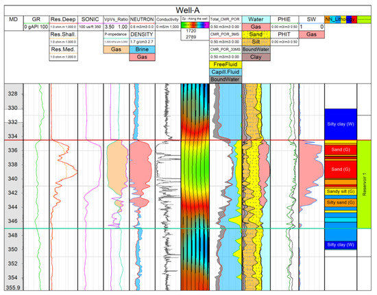 In the case of the analyzed reservoir, all available well logs were strongly influenced by the gas effect, and parts of seismic volume were considered to correspond to a gas-saturated reservoir. Acquired well logs and fluid saturation profile indicate more significant variations in reservoir quality than indicated from, in general, low-contrast porosity curves (Figure 13). Based on the analog data from the neighboring fields, primary routine, and special core analysis, it was assumed to be a consequence of variations in lithology. Core data for the analyzed reservoir were not available.