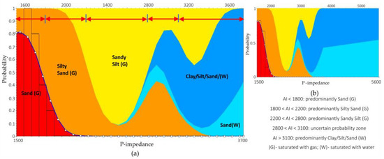 Different approaches to seismic data utilization for lithofacies propagation in the reservoir model are available. Grana et al. (2013) [33] and Babasafari et al. (2020) [34] documented good examples of facies probability prediction based on seismic inversion. Interdependence between Lithology classes and Zp here has been examined by facies probability analysis. The probability of each occurring Lithology class is driven by the histogram-based relationship with Zp as a secondary attribute (Figure 15). Generally, lower impedance values are associated with gas saturation and higher impedance with water saturation. According to the facies probability analysis, for the P-impedance values lower than 1800, the most probable Lithology class is gas-bearing sand, and for the values between 1800 and 2200, it is gas-bearing silty sand. P-impedance range between 2200 and 2800 is characteristic of the poor reservoir but still gas-bearing. There is an uncertain probability zone related to the P-impedance range 2800–3100. Water-bearing Lithology classes, according to the well and seismic data, are characterized by P-impedance values above 3100, but a clear distinction between water-bearing sand and clay inside reservoir interval based on seismic data only was not possible.